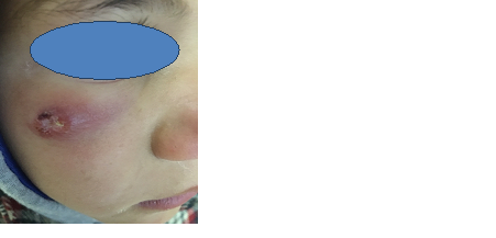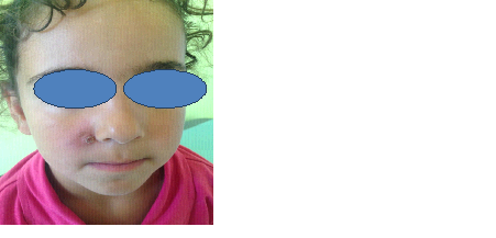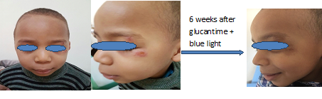 Twelve children were collected. The average age was 11.3 years with a minimum age of 1 year and a sex-ratio H / F of 0.93. All patients lived or had been in endemic areas. A fall preponderance was noted (41.6%). The most common clinical aspect was ulcero-crusted nodule (53.3%), single (63.3%) and on the face (65%). One patient presented mucocutaneous leishmaniasis. The diagnosis was clinically suspected and confirmed by direct parasitological examination (56.6%) or histological examination (35%). Glucantime ® was the treatment of choice, used intralesionally (70%), cryotherapy and blue light were adjuvant therapy in half of the patients. The evolution was favorable in almost all the cases in a variable delay of 4 weeks to 8 weeks. The use of systemic treatment was necessary in 2 children: glucantime in IM, in one patient it was complemented with dynamic phototherapy. Scars were noted in 2 cases (18%) with residual pigmented (1 case) or atrophic (1 case) scars. (Table1), (Figures 1-5).