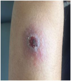 Our serie is characterized by a predominance of women, which ties in with Tunisian data.1,2 The average consultation time, relatively long in our series, could be explained mainly by the painless ness of the lesions. To our knowledge, there are only a few series published in the literature on cutaneous leishmaniasis in children. The average age of patients was lower than that of patients with a series of Algeria and higher than that of patients with a Tunisian series.3,2 Most of the skin lesions in our series were ulcerated. Many clinical presentations are possible: papulo-nodular, lupoidal, sporotrichoid, impetigo and erysipeloid.4 The lesions are often unique and localized very frequently in the face, because this location is easily accessible to sandflies.5,6 Our series is characterized by frequent participation of the hands and forearms, while in another moroccan series lesions were predominant on the cheeks.2 To confirm the diagnosis, it is necessary to carry out a parasitological examination. The story may reveal a family history of cutaneous leishmaniasis in 5 percent of cases as the case of 12% of our patients.5 Therapeutic abstention, when it finds its indication, is recommended more broadly in children because of the binding nature of the treatment.7 Meglumine antimonite intralesional is the treatment of choice for localized lesions.5 This treatment is effective and well tolerated in children. Intramuscular injections of meglumine antimonite can be used in case of periorificiel involvement, multiple lesions, a poor response to local treatment, satellite lesions testifying to cutaneous or lymphatic spread, and in the case of regional lymphadenopathy. Other treatments proposed in cutaneous leishmaniasis in children such as Clarithromycin, fluconazole, dapsone, azithromycin and rifampicin. Surgery, cryotherapy, laser and intralesional bleomycin have been used successfully. These treatments have a very limited use because they are not subject to rhandomized evaluations.3,2,7
