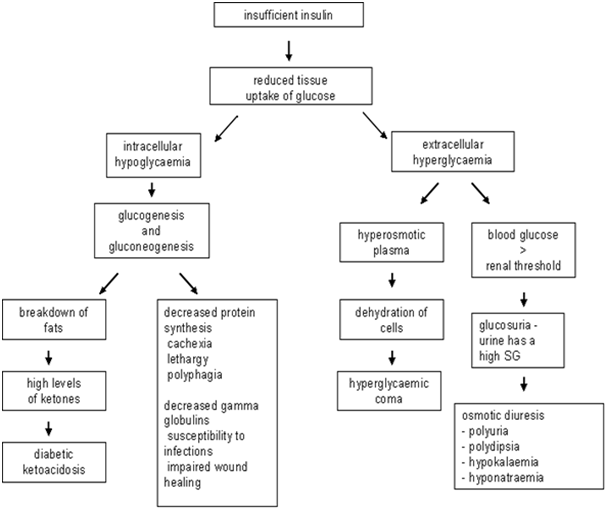 Usually blood glucose levels are maintained within a range of 60-150 milligrams per deciliter, or mg/Dl in healthy people throughout the day. Insulin plays a very important role in the regulation of blood glucose. Insulin is synthesized in the beta cells of the pancreas and is secrete rapidly into the blood in response to elevations in blood sugar such as after meal. insulin serves the following functions such as it maintains glucose homeostasis by promoting uptake of glucose from blood into cells by its storage in the liver as glycogen. It also promoted the uptake of fatty acids and amino acids and their subsequent conversion into triglyceride and protein stores. Lack of insulin or insulin resistance which is seen in DM, results in an inability of insulin dependent cells to use blood glucose as an energy source. Stored triglycerides are broken down into fatty acids, which serve as a alternate source of fuel and an elevation in blood ketones leads to diabetic ketoacidosis. As blood glucose level is elevated (hyperglycemia), glucose is excreted in the urine and excessive urination (polyuria) occurs because of osmotic diuresis. Increased fluid loss leads to Dehydration and excessive thirst (polydipsia). Since cells are starved of glucose, there will be increased hunger (polyphagia) and cells are unable to take up glucose the diabetic patient frequently loses weight and these are the classic signs and symptoms of DM.1 (Figure 1).