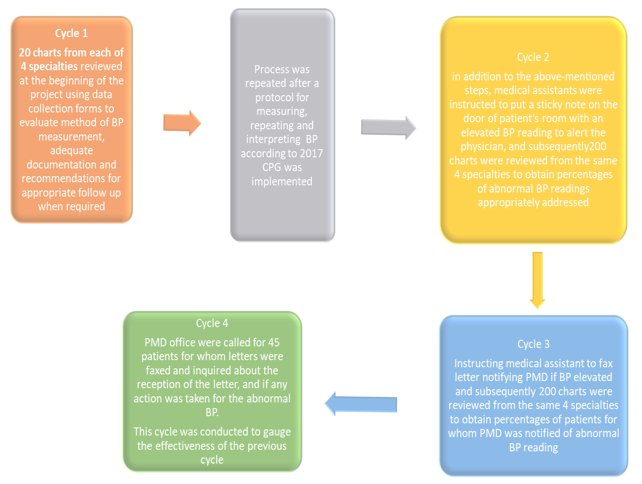 Table 1 Summary of results from four sequential PDSA cycles showing changes in blood pressure documentation, identification of elevated BP, physician acknowledgment, and follow-up actions