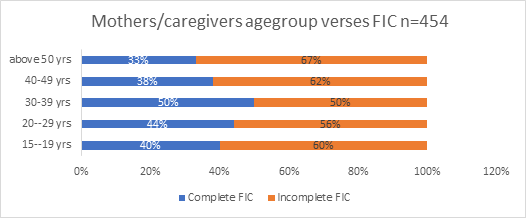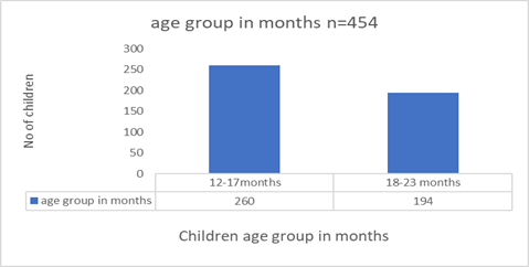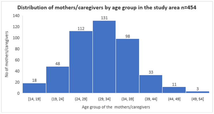 There were 454 mothers/caregivers who completed interviews for household surveys and immunization questionnaires in five wards of Narok South Sub County. The overall household response rate was 100% across all the wards in the study area. As illustrated in Figure 1 the ages of the mothers/caregivers were normally distributed with a mean age of 31 years and standard deviation of 6.6. In addition, the total number of children sampled during the period of review were 454, with a mean of age 17 months, SD ±3.15, range (12-23 months) and the median age was 17 months (interquartile range [IQR]: (12-23). There was no association between age groups and fully immunized children χ2 =3.6195, df=4, and p value=0.460.