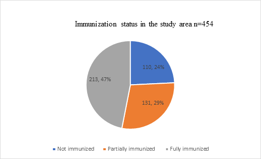 Results: The total number of mothers/caregivers who were interviewed were 454, with a response of 100%. Results of immunization coverage; BCG 73%, OPV1 59%, OPV2 51%, OPV3 49%, Penta1 58%, Penta2 51%, Penta3 50%, Measles 54% and Fully Immunized Children 47%. Further, 47% of the children in the sub-county were fully immunized and 53% were unimmunized. The SD mean for mothers/caregivers and children 31.4 and 17.0 respectively and over 70% of the mothers/caregivers had no formal education. There were significant association predictors with immunization coverage included maternal education (X2 =11.75, df=4 p value=0.02), distance to health facility (X2 =62.30, df=2 p value=0.00), also, there was strong significant association with childbirth ranking (OR=1.218, p value=0.04). Bivariate analysis, there was an association with mothers/caregivers’ who had more than one visits with fully immunized children (χ2=13.54, df =2 and p value =0.001), source of the immunization information OR=0.75 and p value=0.02 and, ultimately, there was association between mother’s/caregiver place of delivery with non-fully immunized children (X2=74.40,df=1 p value=0.01). Predictors of non-fully immunized children in the study population were; place of delivery, family size, education level, source of income, none attendance of Antenatal clinics, distance to the health facility, source of the vaccination information was associated with incomplete fully immunized children.