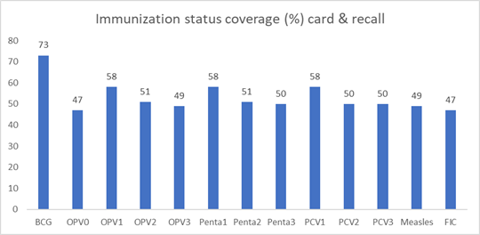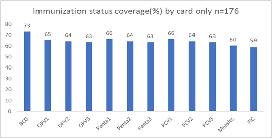 In relation to immunization by card only, BCG coverage was 73%, OPV1 65%, OPV2 64%, OPV3 63%, Penta1 66%, Penta 2 64%, Penta3 63%, PCV1 66%, PCV2 64%, PCV3 63% MCV 60% and FIC 59% as illustrated in the graph below (Figure 4).