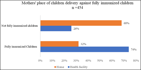 This study revealed that children aged 12-23 months who were born in a health facility were more {AOR = 0.2332 (95% CI: 0.1467, 0.3708} likely to be fully immunized compared to those are born at home. A similar study results by Kiptoo also showed that children who are born at health facility are five times more likely to be fully immunized compared to those born at home. On the other hand, another study carried out in Ethiopia by Mesfin, indicates that children aged 12-23 months born at the health facility are likely [AOR = 2.4 (95% CI: 1.38, 3.65)] to be fully immunized compared to those children who are born at home. A study by Awino, was also coherent with our results indicating that index children born at health facility are more likely to be fully immunized that those born at home. In addition, other studies which share analogous results were conducted by Diekema et.al.,11 with relationship of place of delivery and fully immunized children. Pertaining to contraceptive, majority 57% of mothers were using modern contraceptive for family planning.