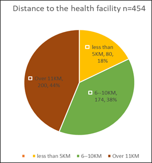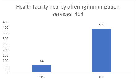 As shown in Figure 20, more than three quarters of the caregivers from the study population 390 (86%) have no health facilities or vaccinations post near them. While, 64 (15%) had health facilities or vaccination post close to them. Regarding to KII (health care providers) and FGDs (mothers/caregivers/opinion leaders), all of them concurred that, communities do complain of distance in accessing the health facilities and terrain with scarce transport. In regard to distance to health facility, majority of caregivers 200 (44%) had to cover over 11 kilometers to access immunization services within the sub-county, 174 (38%) mothers/caregivers had to travel between (6-10 kilometers) and 80 (18%) covered less than five kilometers to reach vaccination post. As per the Pearson chi test, there was significant association between distance to the health facility and fully immunized children χ2=62.30, df=2 and p value=0.00 (Figure 21).