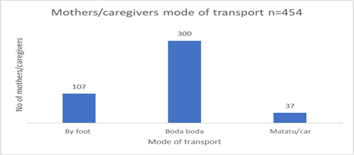 Most mothers/caregivers 300 (68%) would prefer to use boda boda (motorcycle taxi) as means of transport to take their children to vaccination health facility, followed by walking by foot with 107 (24%) and the least would choose 37(8%) to use matatus. As illustrated in figure 24 ,the graph demonstrates mode of transport by mothers/caregivers to the health posts. As per the Pearson chi test, there was an association between distance to the health facility and fully immunized children χ2= 26.55, df=2 and p value=0.00 (Figure 22).