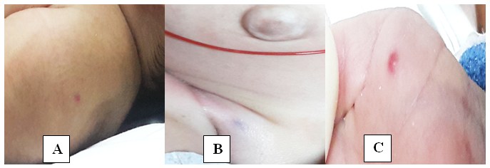 Figure 1 Red papular lesions each sized about two mm over left shoulder (A), pubic region (B) and palm of right hand (C).