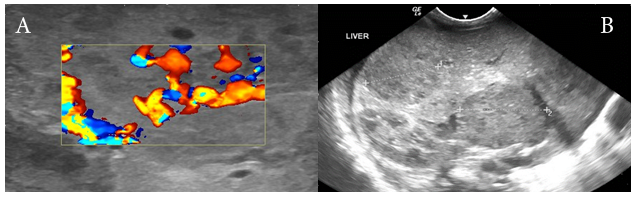 Figure 2 (A) Longitudinal sonogram of the liver showing multiple hypoechoic areas within the liver parenchyma. (B) Doppler examination of these multiple small hemangiomas demonstrating the AV shunting of blood within the hemangioma.