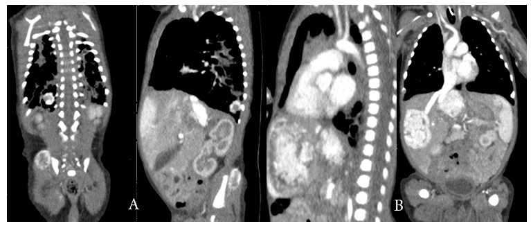 On day 30 of life baby started to show red papular lesions over palm of right hand, left shoulder and pubic region, each sized about two mm (Figure 1 A, B and C) for which the following investigations were done:Ultrasonography of the abdomen revealed multiple oval hypo‒echoic lesions of different sizes. The largest lesion measured around 3mm×3mm. Doppler examination showed the presence of feeding blood vessels (Figure 2 A and B). A CT examination of the abdomen with contrast was advised for further evaluation of the liver, to aid a differential diagnosis between hemangiomatosis, metastases, and liver abscesses. This revealed enhanced lesions with multiple foci in both the hepatic lobes with arteriovenous shunting in the form of dilated branches of the hepatic artery and prominently draining hepatic veins. It was reported that the lesions could possibly be hemangio‒endothelioma or infantile angiosarcoma. Additionally, the right basal segment of the lower lobes of the lungs and right gluteus maximus muscle revealed lesions with multiple foci, which was presumed to be a secondary deposit (Figure 3 A and B). The tumour marker AFP (20,777 IU/mL), liver functions were normal apart from mild elevation of alkaline phosphatase (513 IU/mL), and total bilirubin (1.9 g/dL). Repeat test after a week revealed decreasing values. Fundoscopy screen on day 33 of age showed ROP stage 1 bilaterally and a repeat follow up after 2 weeks was normal and was instructed for follow up after 6 months.