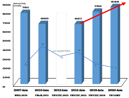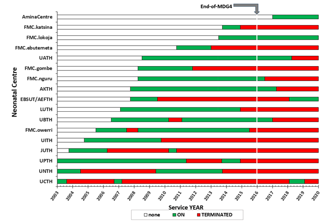 The collaboration with CCETH died-off owing to lack of leadership interest in 2016 and all active drives ended across the nation, except at three neonatal centers (SCBUs) where the program continued, howbeit, in skeletal form, namely: Alex-Ekwueme Federal Teaching Hospital Abakaliki, Federal Medical Centre Lokoja and the Amina Centre of General Hospital Minna. Figure 3 also demonstrates the negative impact of the total withdrawal of our active drive, leading to the termination of our national program, as Nigeria’s corporate overall NMR has since continued to soar till date.