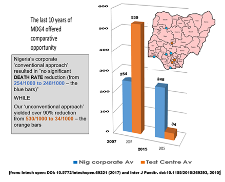 The knowledge of neonatal anatomy, physiology and standard intervention technologies were explored and harnessed. Other mortality impacting factors were studied and applied, including regional climate changes, poor national infrastructure, practitioners’ knowledge gaps, and societal behavioral patterns. Frugal, compatible, and sustainable devices and procedures were strategically developed and improved upon over 20 years, beginning from 1996, supported with concerted training of practicing professionals who trialed and applied our emerging technologies at tertiary hospitals across the entire regions of Nigeria. The GlobalHealth drive of the UN’s Millennium Development Goal Target No.4 (MDG4) was leveraged upon as justification to initiate a corporate collaboration with motivated Chief Medical Directors (CMD) at Nigerian referral hospitals, mediated through the comradeship of the Committee of chief executives of tertiary hospitals (CCETH) of Nigeria in 2007.