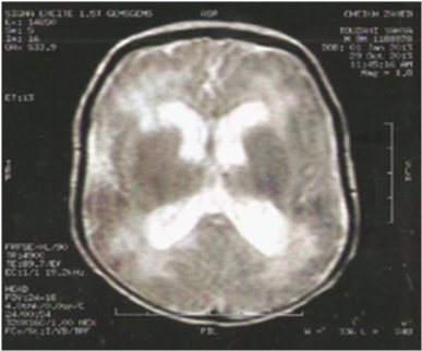 It was a 2 month old admitted to our department for hydrocephalus and brain calcifications. Following a well-attended term pregnancy of non-consanguineous parents. The mother was aged 25 years without significant history. Maternal serologies (toxoplasmosis, mumps, rubella, syphilis, hepatitis B, C) were negative. Morphological antenatal ultrasound was demonstrated, moreover, a triventricular hydrocephalus and diffuse cerebral calcifications. Childbirth was normal. Birth weight was 2770g, with a size of 50cm and a head circumference HC of 36.5 cm. The patient had consulted 15days of life; transfontanellar ultrasound had objectified triventricular hydrocephalus with periventricular calcifications. A brain magnetic resonance imaging MRI revealed calcifications in the white matter and active triventricular hydrocephalus (Figure 1). On admission, the newborn was pink toned, responsive and a febrile, the weight was 4300g (-1 SD), the size of 55Ccm (normal), with a PC to 41cm (+2 SD). Neurological examination noted axial hypotonia. The remainder of the physical examination was unremarkable. Biologically, there was an inflammatory syndrome with increased C-reactive protein (CRP) plasma at 47mg/L, normochromic - normocytic anemia, a hemoglobin concentration of 9g/dL and ferritin increased to 600mcg/L, white blood cells and 10054/mm3 to a normal platelet count. Renal and hepatic functions were correct. Cytomegalovirus, rubella and toxoplasmosis serology were negative. Polymerase Chain Reaction PCR CMV was positive (3000 copies/105 L). Antiviral treatment had proposed by ganciclovir 10mg/kg/24h for 6weeks, we obtained a good outcome. Neurological monitoring (electroencephalogram EEG, evoked auditory and visual) and hematological outcome 3 months later was averted complications medium term. The patient had an external ventricular drainage (EVD) at 6 months. The evolution was favorable.