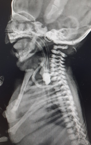 Esophageal Foreign body(FB) more commonly occur in pediatric population from 6 months to 3 years of age due to curiosity and tendency for oral exploration. Although coins are more commonly found esophageal FBs but button batteries, marble stone, pins, nails have also been reported.1 Delay in treatment can lead to complications like perforation, stricture, abscess or death. Early treatment can prevent morbidity and mortality. Respiratory distress with drooling of saliva in newborn is usually considered as esophageal atresia with/without trachea-esophageal fistula (EA/TEF). In a neonate, occurrence of esophageal FB is rare as newborn is on milk-feed and is not picking up, or exploring objects. Diagnosis is difficult to make because of fallacious negative history. Neonatal FBs are usually incidental, due to negligence, sibling curiosity or homicidal.