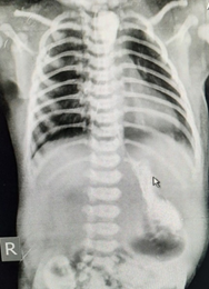 On examination, heart rate was 147/min, blood pressure was 75/50 mmHg, and respiratory rate was 52/ min, SPO2 was 97% with oxygen and capillary refilling time was <3 sec. with chest retraction. She had moderately increased secretions from mouth with bilateral conducted sounds. Feeding tube could not be negotiated into stomach. X ray showed coiling of infant feeding tube and large radiopaque shadow in the upper esophagus (Figure 1). Fact that child had accepted feeds well for initially 3 days without any discomfort, raised doubt in it being esophageal atresia. Contrast study was done which revealed large opacity from T2-4and trickling of contrast in stomach ruling out EA and esophageal perforation (Figure 2).