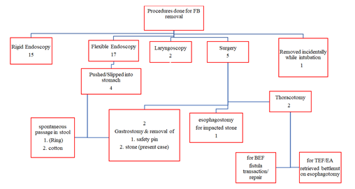 Various techniques like flexible endoscopy, rigid endoscopy, magnet, foley’s catheter, pushing the FB into stomach, gastrotomy, esophagotomy and thoracotomy have been done depending upon the situation (condition of child, esophagus, availability of equipments). Based on these procedures done for FB removal in neonates, suggested procedures/options are depicted in chart 2.