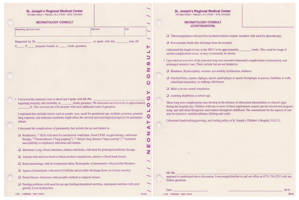 Perinatal Counseling allows women at risk for preterm birth to learn about the prognosis of and complications faced by their infant.1,2 Perinatal consultation by a neonatologist also establishes some degree of continuity of care for parents of infants who will be in cared for in a complex and intimidating environment.3 With 11 neonatologists providing this information our institution initiated a standardized form Figure 1 in 2005 for use during perinatal consults. This two page form contains information on pregnancy complications, gestational age, survival, and expected duration of hospitalization of the infant. Complications of prematurity and long term sequelae are discussed in a systems based checklist to ensure that all applicable topics are covered. Specific information regarding prognosis and outcome is individualized on a case by case basis, depending on gestational age, estimated weight and additional risk factors. Though some of the information presented may be forgotten by parents it is hoped that the consultation will allow parents to feel more comfortable with and engaged in the care of their preterm infants.