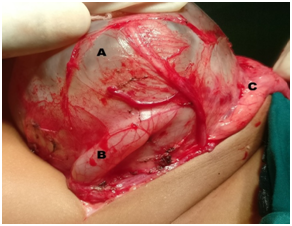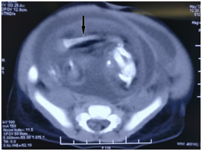 A 5 month old boy was admitted to Department of Pediatric Surgery, BSMMU on May 2017. At the age of 1 and half months, his parents noticed a lump in hislower abdomen. The lump is gradually increasing in size and is not painful. The boy has occasional vomiting but no other complains. The mother wasn’t on regular antenatal checkup however there was no history of any maternal illness, exposure to radiation or drug intake during pregnancy. There was no family history of multiple pregnancies. The boy was delivered by cesarean section as he was postdated. His postnatal period was uneventful. On clinical examination, there was a 10x10cm, well-defined, firm, non-tender, round mass occupying the right lumbar region, right iliac fossa, umbilical, hypogastric region and left iliac fossa. Laboratory investigations were within reference ranges. Alpha-feto protein was 36.25ng/ml (up to 15 ng/ml) and beta-HCG was 0.34mIU/ml (within normal range). Ultrasound of abdomen showed a large complex mass having solid, cystic components located on the lower abdomen. It measures about 10.6x9.0 cm. the mass is separated from right kidney. Also, in kidney, pelvicalyceal system are moderately dilated but cortex medulla are well defined. CT scan reported one fetus measuring about 12x11 cm is noted in the pelvic cavity and right lumber region having deformed skeleton within. The lesion is displacing the bowel, bladder and compresses the kidneys and ureters posteriorly. CT scan also reported moderate hydroureteronephrosis. A preoperative diagnosis of fetus in fetu with moderate hydroureteronephrosis was made (Figure 1 & Figure 2).