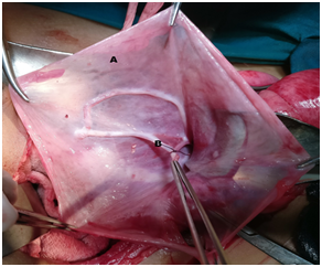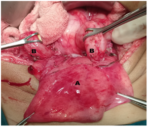Parents were counselled for surgery and elective laparotomy was performed. We found a large retroperitoneal cystic mass displacing the bladder anteriorly and gut laterally. Dilated ureters were present on posterolateral aspect of the mass. The bladder was dissected free from the mass and the cystic component of mass was decompressed and the fetus removed after ligation and sectioning of the cord and the membrane also removed after dissection.