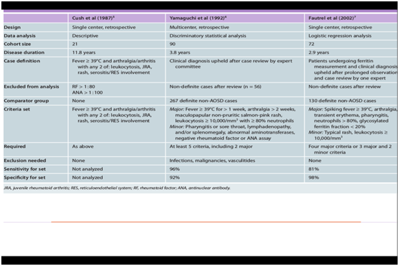 This disease has been defined as systemic arthritis by the International League of Associations for Rheumatology (ILAR) classification of juvenile idiopathic arthritis (JIA), 2 systemic-onset juvenile rheumatoid arthritis (JRA) by the American College of Rheumatology classification, or systemic-onset juvenile chronic arthritis by the European League against Rheumatism classification. Diagnosis of systemic arthritis by the ILAR criteria requires the presence of arthritis and a documented quotidian fever of at least 2 weeks’ duration, plus one of the following: typical rash, generalized lymphadenopathy, enlargement of liver or spleen, or serositis. Criteria and exclusions are shown in Table 1&2.2–9