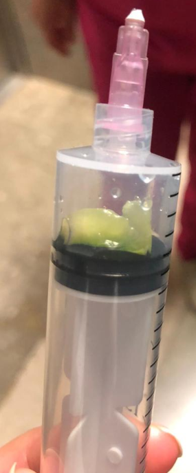 An 11-month-old boy applied to the Pediatric Emergency Service due to sudden respiratory distress. The patient's anamnesis was taken, and it was learned that he started to cough after eating cucumber. He had no respiratory complaints or other health problems in the last month. In the respiratory examination of the patient, rhoncus was heard in the bilateral lungs, other system examinations were normal. Chest radiography was not evaluated in favor of FBA in the first evaluation (Figure 1). Pneumonia was considered in the differential diagnosis because of bilateral infiltration on chest radiography and bilateral rhoncus on examination. The COVID-19 PCR test was negative. The patient was given inhaled salbutamol treatment, and respiratory distress did not regress after salbutamol treatment. When the chest radiography of the patient was examined in more detail, an area compatible with air trapping was observed in the right upper lobe (Figure 1). Bronchoscopy was performed on the patient, and a piece of cucumber with a size of 1X0.5 cm was removed (Figure 2). The patient whose complaints regressed after bronchoscopy was discharged with full recovery.