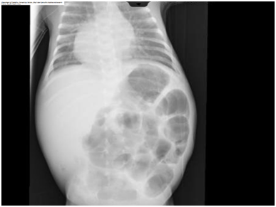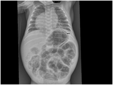 A male infant, twin B was born at 32weeks’ gestation by cesarean section due to fetal distress to a 26year old gravida 2 and Para 1 mother. The antenatal ultrasound of our patient showed congenital heart disease. The maternal history was insignificant. He weighed 1880grams and had Apgar scores of 9 and 9 at 1 and 5minutes respectively. He developed respiratory distress immediately after birth and required intubation and mechanical ventilation. There was no dysmorphic features. Echocardiogram and C.T cardiac with contrast showed dextrocardia, trunk’s arteriosus, interrupted aortic arch, large ventricular septal defect and patent ductus arteriosus. He was clinical stable and was started on enteral feeds. He had episode of gastric aspirates but they were considered insignificant. At two weeks of age he became septic with abdominal distension. He required dobutamin to restore his low blood pressure. Abdominal radiographs showed gastric and intestinal pneumatosis without any evidence of free intraperitoneal or portal venous air (Figure 1). Leukopenia and thrombocytopenia were present. He was started on antibiotics (ampicillin, gentamicin and metronidazole). He passed bloody stools with mucous. He required several platelet transfusions to correct the severe thrombocytopenia. The septic workup showed sterile blood cultures. His abdominal radiographs improved on day five of treatment (Figure 2). His head ultrasound was normal. The clinical condition of the infant significantly improved.