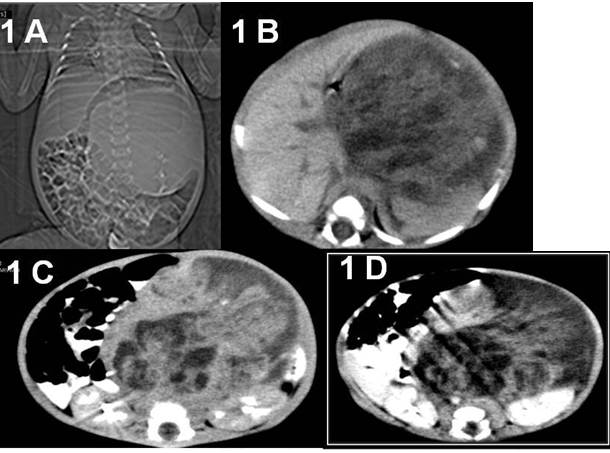 A 6 weeks old male infant, born by normal vaginal delivery at home, presented to our hospital with progressively increasing abdominal mass of 10 days duration, associated with poor feeding. Antenatal care was unsupervised. There was no history of fever, weight loss, bowel or urinary complaints. Post natal period was uneventful. On examination the abdomen was distended, a large firm mass occupying the central and left upper abdomen measuring about 15x 12x10 cm in maximum dimensions. No tenderness on palpation or overlying skin changes. The rest of general examination was unremarkable. Routine blood tests and urine analysis were all within normal limits. The serum levels of alpha-fetoprotein (AFP) was normal. A plain abdominal X-ray showed a well defined round radio-dense mass seen projecting at the left side of the abdomen, mass effect was evident marked displacement of the bowel loops peripherally (Figure 1A). Ultrasound of abdomen showed a large heterogeneous mass located on the left side associated with areas of cystic components. Contrast enhanced computed tomography (CECT) scan of the abdomen and pelvis demonstrates a large retroperitoneal heterogeneous mass occupying predominantly the left suprarenal region, measuring about 12 x 10 x 8 cm with two clumps of calcification, fatty tissue, and cystic contents. The mass crossing the midline was displacing the aorta and Inferior Vena Cava to the contralateral side and the left kidney posterior-inferiorly (Figure 1B&1C). The rest of abdominal and pelvic organs were within normal limits.