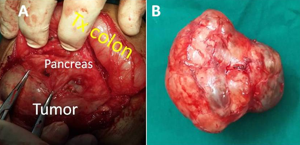 2A On laparotomy a large complex solid and cystic mass with well circumscribed smooth borders. The pancreas is flattened and stretched over the tumor