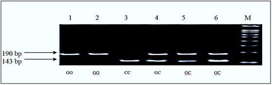 IL-6 promoter polymorphism (-174 G/C): DNA was extracted from whole blood using Qia-amplification extraction kit (Qiagene, USA). The concentration of the extracted DNA was determined by using a spectrophotometer at wave length 260 nm. A100 ng genomic DNA template was used to amplify the promotor region of IL-6 (-174 G/C) in a total volume of 25ul.The Primers used for amplification were:5’-TGACTTCAGCTTTACTCTTGT-3’ and 5’-CTGATTGG-AAACCTTATTAAG-3’. The PCR cycling condition was denaturation at 95°C for 10 min followed by 35 cycles of denaturation at 95°C for 45 sec, annealing at 52°C for 45sec, and extension at 72°C for 60sec. The PCR products were detected bygel electrophoresis at 190 bp.PCR product was digested with 10 U of the enzyme NlaIII (New England Biolabs) overnight at 37°C and visualized in a 2.5% agarose gel stained with ethidium bromide. The C allele creates a cut site for the restriction endonuclease NlaIII leading to 2 DNA fragments of 143 bp and 47 bp, respectively.