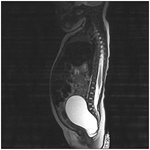 Our assessment revealed a healthy baby girl with a large fixed supra pubic mass which was tender to palpation. The urinary catheter was in situ and draining clear urine. Per rectal examination was done, the mass was easily palpable at pre sacral area. An urgent ultrasound abdomen was performed; it revealed a cystic mass in the pelvis 10cm x 5cm; (larger than previously documented radiologically), no calcification was noted, there was also mild right hydronephrosis. An MRI was carried out to enable us to differentiate between anterior meningocoele and a sacrococcygeal teratoma. The MRI showed a large pre-sacral cystic mass consistent with an intra-pelvic teratoma (Figure 1). Her Alpha-fetoprotein (AFP) was 3746 unit (normal range 0.00 – 6.74). BHCG 4.2 IU/L (normal range < 5 IU/L). Her renal profile was also normal.