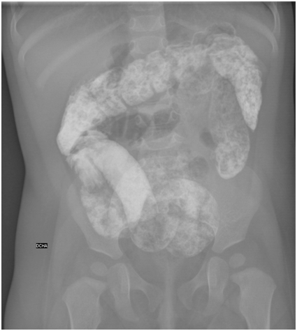 We present the case of a previously healthy 9-month-old infant who went to the Emergency Department due to a 7-hour evolution of paroxysms of abdominal pain with vegetative symptoms that alternated with hypoactivity and progressive lethargy. Anorexia and vomiting were also associated, fever was absent and the last stool was 12 hours prior, with normal characteristics. Vital signs were normal. On physical examination, the involvement of the general state with obtundation was noteworthy. The meningeal signs were negative, and there was no neurological focality. The abdomen was painful and presented tenderness on the right flank without signs of peritonism. Blood analysis was normal, and urine was negative for toxins. Abdominal radiograph revealed abundant radiopaque material in the small and large intestines without signs of intestinal perforation or pneumatosis (Figure 1). Abdominal ultrasonography confirmed ileocolic invagination. The parents denied the administration of contrast but reported copious sand intake 10 hours before the onset of symptoms. In view of the clinical suspicion of intestinal invagination secondary to massive sand intake, ultrasound guided hydrostatic reduction was performed. During the procedure, the symptoms suddenly ceased and the patient became asymptomatic. A large amount of sand was removed. Sand enteropathy due to ingestion of sand is rather common in horses.1 Geophagia is a form of pica considered normal in some cultures. Its aetiology is multifactorial and has been postulated as a marker of possible micronutrient deficit.2 One of its complications is intestinal obstruction and may be the point of origin of an intestinal intussusception.3-5