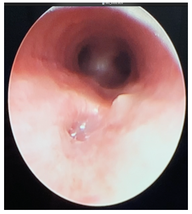 Figure 2 Bronchoscopy: 3 mm diameter tracheoesophageal H-fistula located 5 rings above the carina.