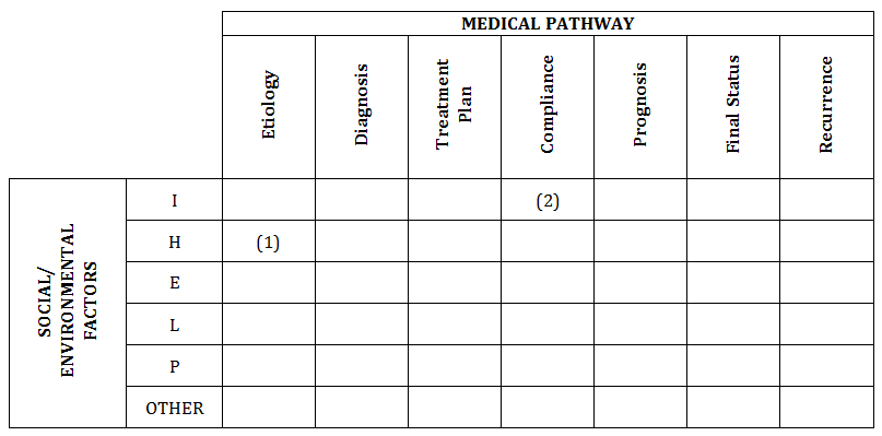 Proceeding across the row, we might consider the extent to which housing affects diagnosis, treatment planning, etc.Similarly, Box [2] (above) considers how family Income affects compliance with treatment, whether through the cost of prescriptions, correcting hazardous housing conditions, or attending follow-up appointments.