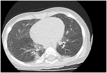 This is report of a 1 year old girl who was born at term and had normal antenatal scans. She was diagnosed to have supraventricular tachycardia in perinatal period. SVT was labelled AV nodal re-entrant tachycardia. An echocardiogram showed a structurally and functionally normal heart. She was started on flecanide for management of SVT. She was readmitted to hospital at five months of age with bronchiolitis. This was a clinical diagnosis of bronchiolitis without any isolation of bacteria or virus. She required oxygen for next week through day and night with attempts at weaning being unsuccessful. She was therefore discharged home on oxygen at 0.5litres per minute. A repeat echocardiogram did not reveal any structural or functional abnormality. At this point, investigations for interstitial lung disease were also started. All investigations were normal apart for CT chest findings. CT chest reported patchy, predominantly central and dependent ground glass/ airspace opacification involving all lobes of both lungs. The central para mediastinal distribution of the ground glass opacification was suggestive of Neuroendocrine Hyperplasia of Infancy (Figure 1).