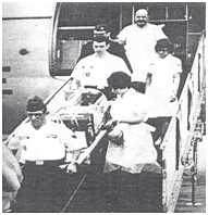 In parallel with the expansion of ground neonatal transportation systems, air transportation began to develop. The first air neonatal transportation was held in 1958 with the fixed wing transport Colorado Air National Guard.19 In 1967, the transportation of a preterm infant to St. Francis Hospital, Peoria, Illinois with Peoria Journal Star helicopter was the first one using first motor wing.19 In 1970 Shepard described for the first time a flying intensive-care newborn nursery in the military system, on a C-9 aircraft. “An especially Sierracin cradle warmer with removable end pieces, monitor for heart rate, respiratory rate, and blood pressure, volume respirators and laboratory equipment for blood gas determinations with micro electodes. The infant is cared for by the flight pediatrician and by the flight nurse”34 Figure 8. Air neonatal transportation policy began in 1972 with the Flight for life Denver’s Saint Anthony Hospital.35