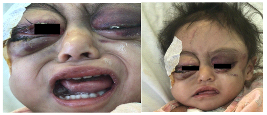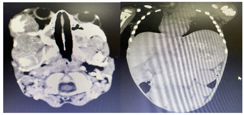 A 1-year-old female patient, previously healthy, presented with two eye traumas secondary to opsoclonus-myoclonus syndrome, which had been evolving for two months, in addition to fever spikes that were difficult to control. She was admitted to a tertiary hospital, where a complete blood count revealed severe anemia (Hb <7 g/dL). PCR for SARS-CoV-2 was positive. Thoracoabdominal X-ray revealed a mediastinal mass and retroperitoneal extension. During hospitalization in the COVID ward, she presented with a highly progressive onset of retrocular infiltration with ecchymosis and raccoon eyes at 3 days, which she had not presented upon admission, as well as deviation of the tongue to the left side due to infiltration. An orbital and bone biopsy was performed, with a diagnosis of undifferentiated neuroblastoma in orbital tissue and bone marrow.