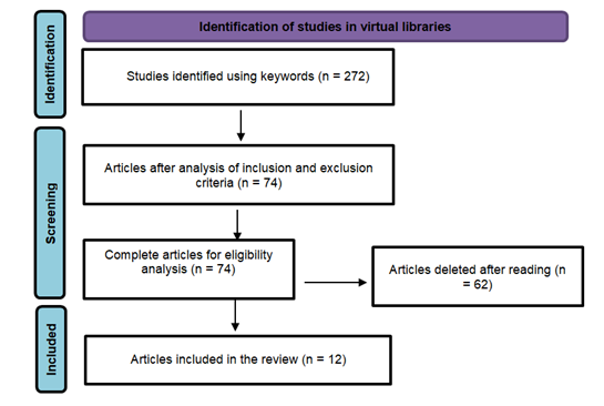 Figure 1 shows a flowchart of the results of the bibliographic search in electronic libraries using the descriptors mentioned above, initially obtaining 272 titles. Of these, 74 texts were identified, with titles and abstracts written and read, with subsequent exclusion of 62 articles as they did not meet the objectives of the study. Thus, 12 eligible articles were found that met the inclusion criteria and the objective of the study.