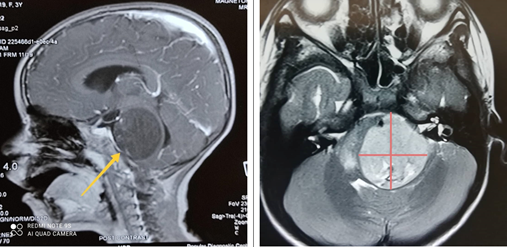 Introduction: Brainstem gliomas (BSGs) occur in the brainstem, located at the base of the brain. BSGs account for 10-20% of all primary CNS tumors. In a hospital-based study conducted at NICRH, BSGs constituted 7.69% of all childhood brain tumors.