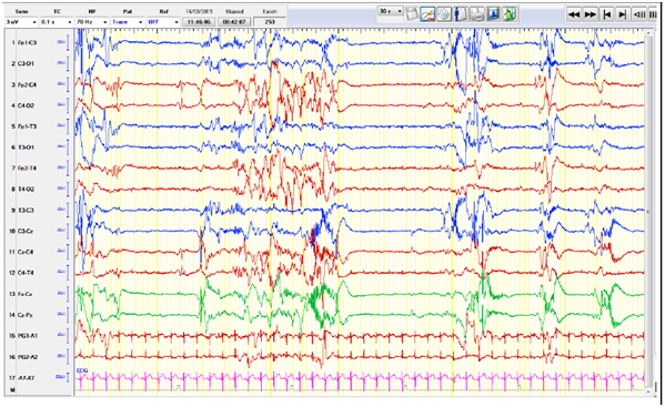 An MRI of the brain (Figure 1) showed features of poor gyration, as well as abnormal appearing white matter with a leukodystrophic appearance and profound pontocerebellar hypoplasia. An EEG was done which showed a burst suppression pattern (Figure 2); a diagnosis of Pontocerebellar hypoplasia type 1 (PCH type 1) was made and appropriate counseling provided to the parents. Genetic testing was not performed.