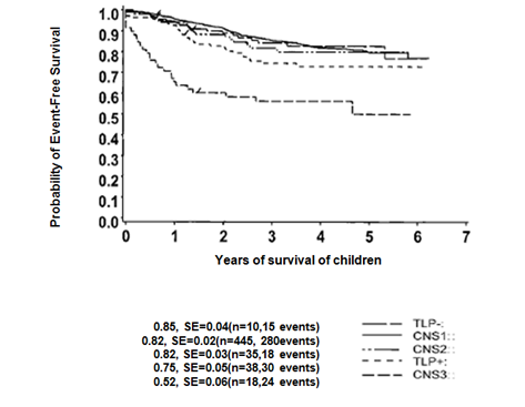 Methods: 546 patients were enrolled based on initial central nervous system (CNS) status: CNS1 (CNS negative, n=445), CNS2 (≤5 WBC/HPF CSF with blasts, n=35), CNS3 (CNS positive, n=18), TLP+ (TLP with blasts, n=38) and TLP- (TLP without blasts, n=10). Lumbar punctures (LP) were performed at initial presentation and again at initial intrathecal (IT) therapy. Effect of traumatic lumbar puncture (TLP) were evaluated and followed-up for three years. Two extra doses of intrathecal methotrexate (IT MTX) were given with CNS2 and TLP+ status of patients. Additional IT MTX and cranial irradiation (CI) 24 Gy units were given to children of CNS3 status.
