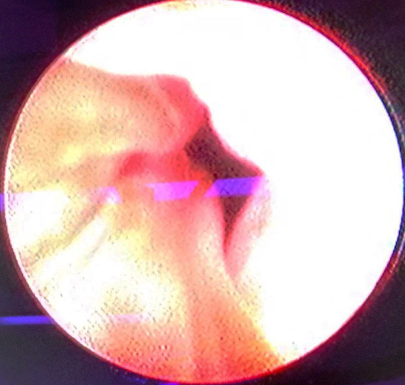 A six months old female patient, presented in the emergency department with a red fleshy actively bleeding introtial mass. She was resuscitated and required blood and fresh frozen plasma transfusions. Systemic examination revealed microcephaly, bilateral genu valgus deformity, local examination revealed, a 5 cms x 3 cms reddish partly gangrenous mass prolapsing through the urethra, the uretheral meatus was completely occluded with it and vaginal orifice was normal (Figure 1). Routine biochemical tests (Kidney Function Test) were normal; there was no evidence of coagulation abnormalities or urinary tract infection. Patent foramen ovale was detected on echocardiography. Ultrasonogram of the KUB region showed mild hydroureteronephrosis on the right side, urinary bladder was normal. Cystouretheroscopy showed the pedunculated mass to be arising in the region of trigone towards right side, right ureteric orifice could not be located, left ureteric orifice was normal and urinary bladder showed no other abnormality (Figure 2). A single prolapsed mass was resected cystoscopically, haemostasis achieved and no 8 Fr Foley’s catheter was left indwelling for 2 days. Histopathology revealed tumor was composed of dilated vascular channels lined with endothelial cells suggesting cavernous haemangioma. She had an uneventful post-operative course, and the hydroureteronephrosis resolved on follow up.
