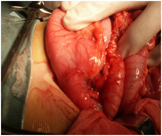 A five year old girl was hospitalized because she has suffered from abdominal pain and non bilious vomiting for a month. Her physical examination was unremarkable except epigastric tenderness. Biologic exams were normal specifically amylasemia. An upper gastrointestinal barium contrast study revealed in spite of a sus carina reflux, a pyloric and antrum deformation, with an extrinseque compression. Oesogastric fibroscopy showed a deformation of pylorus. During surgery, pyloric cystic duplication of 2cm*3cm was noticed (Figure 1). By opening the mass, we found 3 cystic formations; the bigger one has a common wall with the posterior face of the pylorus and the antrum with a narrowed communication. The duplication was resected as well as the common wall and a pyloroplasty was performed (Figure 2). There were no postoperative problems and the post operative barium - meal examination was normal.