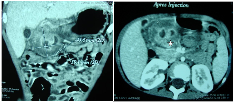Figure 3 Computer tomography: Cystic epigastric mass with a fine wall ( ☆ ) that took contrast.
