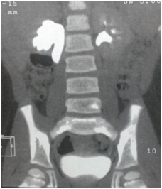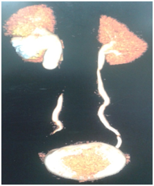 5 year old boy came to our outpatient department with intermittent flank pain since one week. There were no other systemic complaints. Patient was previously investigated & operated for right non palpable testis a year ago. An incidental finding of right mild hydronephrosis (AP Diameter of 12mm) were noted during sonological evaluation. General and systemic examination were normal. Haematological workup was normal. Ultrasonography showed hydronephrosis with antero-posterior diameter of 3.5cm associated with dilatation of upper ureter (dia-9.2 mm). Micturating cystourethrogram was done to rule out vesico ureteric reflux. DTPA renal scan was suggestive of preserved parenchymal function & GFR with significant subrenal obstruction at right peviureteric junction along with upper hydroureter. CT-IVP demonstrated right hydronephrosis with dilatation of the upper ureter due to kinking at junction of upper & middle ureter suggestive of obstruction (Figures 1&2). Left kidney was normal.