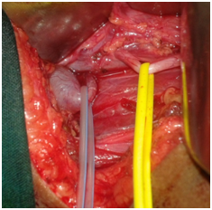 We decided to operate this child in view of the increased hydronephrosis. Child underwent open surgical intervention via right upper abdominal transverse incision. On exploration the ureter was found to dip behind the inferior vena cava after circumscribing the vessel it pursued its normal course, below the bifurcation of the iliac vessels (Figures 3&4).