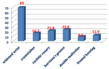 Concerning clinical condition widening of wrist was found in 69% of cases at all age groups and all cases that had craniotabes were under 6 months of age, while the frequencies of other physical signs were variable (Figure 1). As indicated in table below from the total of 170 studied rachitic children, 58% were also diagnosed to be under weight, while other 23% were marasmic, and other 12% were diagnosed to have kwashiorkor and 34.7% were anemic (Table 3).
