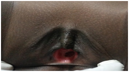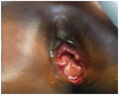 A girl aged of 7 years was admitted in N’Djamena Mother and Child hospital (Chad) on December, 18th 2015 for vaginal pain and bleeding after rape. The onset of symptoms was 2 hours marked by vagina pain and bleeding occurring after the rape of the young by a 20 years old man. The young girl was raped by his neighboring house when hers parents was out. After the odious act he ran away. When parents were back, they discovered their daughter complaining of abdominal pain and bleeding. The admission examination noted a conscious patient, complaining of abdominal pain and bleeding. The general examination revealed a well nourished patient weighing 20 kg with a height of 116cm, conjunctival mucosa well colored with a blood test showing haemoglobin to be 12.4g/dl, a blood pressure 100/60mmHg, radial pulse 75bpm and a temperature of 37.2°C.
