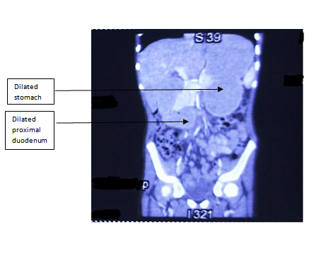 A 10 year old male chid presented with epigastric pain which relieves on vomiting for 10 days. There was a history of significant weight loss of the child secondary to fever of unknown origin over a month. On examination, pallor and visible gastric peristalsis were noted. Ultra sonography of the abdomen was normal. Contrast enhanced computed tomography (CECT) abdomen (Figure 1) (Figure 2) was suggestive of SMA syndrome with dilated proximal half of third part of duodenum and narrow aortomesenteric angle (<110) along with smaller aortomesenteric distance (<5mm). A conservative trial was attempted with nasogastric decompression, IV fluids, total parenteral nutrition and lying on left side or prone position, but proved to be ineffective as the symptoms persisted. Hence, exploratory laparotomy was planned after one week which confirmed the obstruction at the level of third part of duodenum with grossly dilated stomach and proximal duodenum above the level of origin of SMA from aorta and collapsed distal bowel (Figure 3). A side to side retrocolic duodenojejunostomy bypass was done. Postoperative period was uneventful. Oral feeds were started on 6th postoperative day and the patient was discharged on full feeds on 8th postoperative day. The child is asymptomatic and has gained weight on one year follow up.