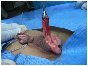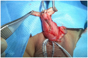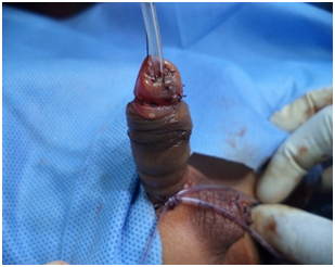 The Midline incision is taken on the scrotum over the median raphe. The dartos fascia is dissected off both the testis on either side. The Dartos flap is elongated further by dissecting the fascia from both the testis and the skin. A tunnel is created under the skin of the penis ventrally and the Dartos flap is pulled up through the tunnel to reach the tip of the penis. Dartos flap is sutured at the tip of the penis over the neo urethra. The Dartos flap is stitched on both sides to the side of the penile body by interrupted sutures of 5-0 vicryl. Glanuloplasty is done by wrapping the glans wings on the urethra and Dartos flap and stitching with 3 interrupted sutures of 5-0 vicryl sutures. The skin hood is rotated forwards and wrapped all around the penis and sutured to the skin below the glans penis and dorsally. Thus there is no overlapping of the suture line between the urethra and the skin. The suprapubic diversion is done by open technique and no. 16 Foley’s catheter is inserted into the bladder. Sofra tulle is applied over the penis all around. A gauze piece is applied over it. A compression dressing is applied over the penis with Elastoplast bandage.
