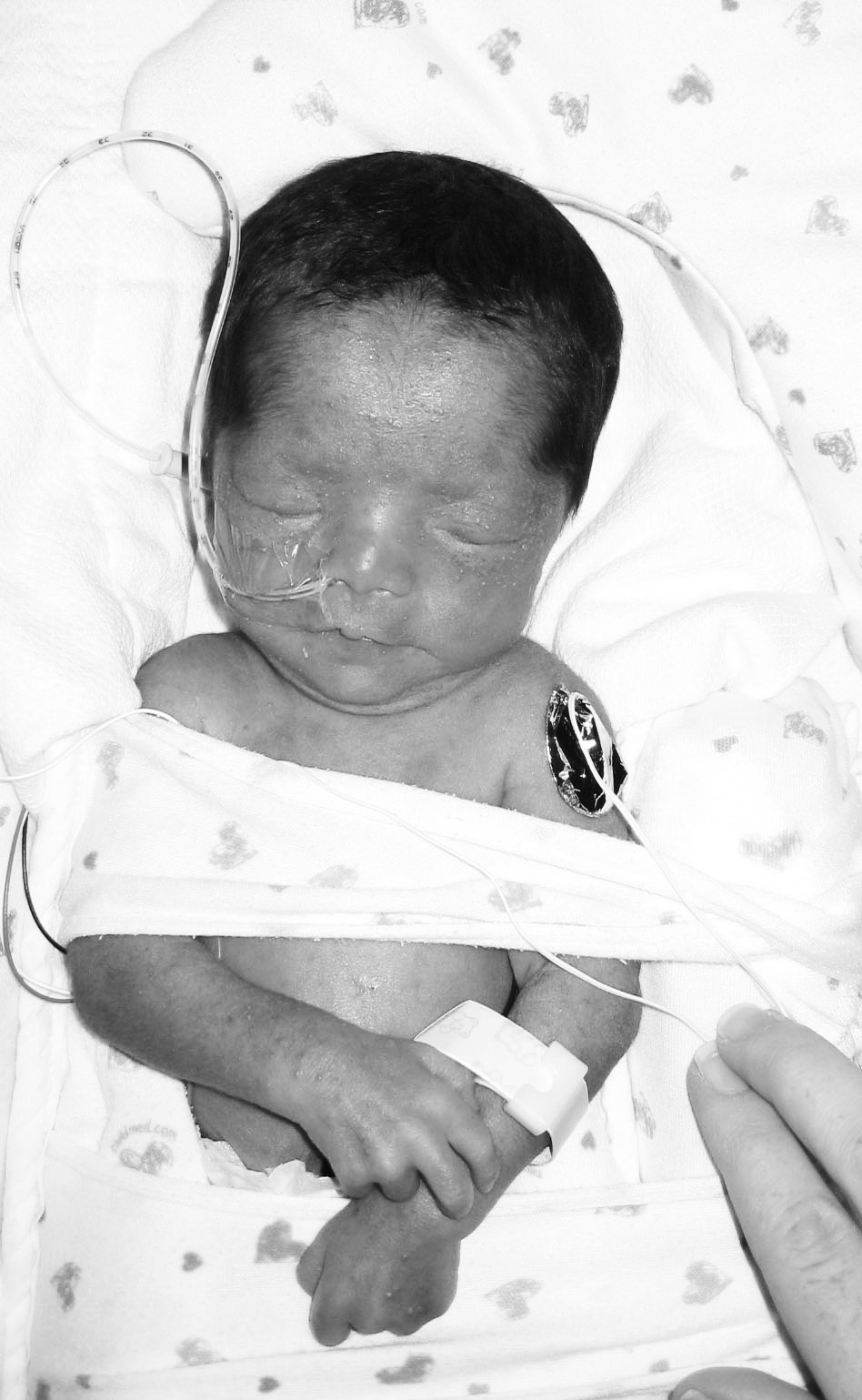 The female patient was the product of a 34 week vaginal delivery to a healthy 19 year old primagravid woman and her unrelated partner with unremarkable prenatal history, no pregnancy complications and unknown etiology for preterm labor. APGAR scores were 5 and 9 at 1 and 5 minutes respectively; birth weight was 1580 g (3rd centile), length was 41.5 cm (5th centile) and head circumference was 30 cm (25th centile). At 5 days of age, genetics consultation was performed for dysmorphic facial features. The family history revealed a maternal half uncle and maternal cousin with cognitive impairment. No congenital anomalies, recurrent pregnancy loss or stillbirth were known but history from the paternal side was minimal. Physical exam showed a female infant with a prominent anterior fontanelle, clinodactyly and dysmorphic features including short palpebral fissures, epicanthal folds, a thin upper lip, a short upturned nose and micrognathia (Figure 1).