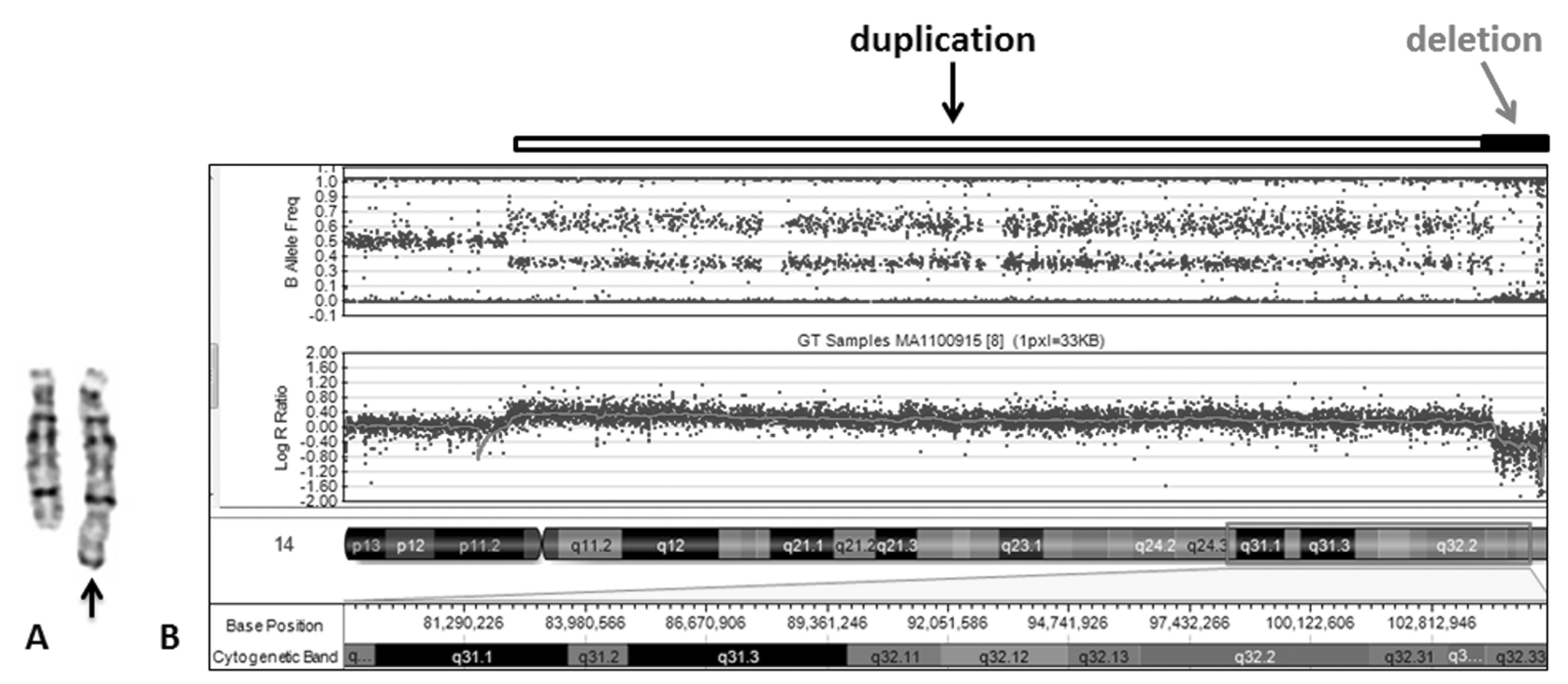 Figure 2 karyotyping and cytogenomic array study. (A) Partial karyotype showing a normal and abnormal chromosome 14 (arrowed). (B) Cytogenomic array analysis of chromosome 14 showing duplication of 14q31.1q32.33 and deletion of 14q32.33 as indicated by open and solid bars, respectively.
